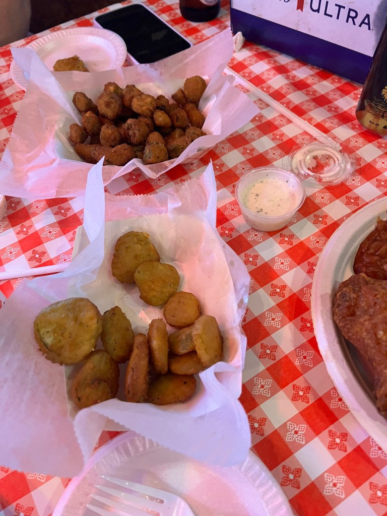 My go-to order is a 2 piece dark meat (thigh and leg), with macaroni and cheese and their greens. If I am eating with others, I might start with the fried pickles or fried okra with ranch. Their fried chicken is delicious, crispy with a flavorful dose of spice (but it’s not Nashville hot chicken-check out Hattie B’s for that!). I also highly recommend trying their sweet tea-it’s very sweet but a good sampling of southern sweet tea.