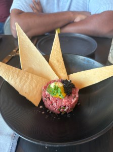 The steak tartare arrived promptly, with chunks of piedmontese beef, a sous vide egg yolk, dijon mustard aioli, and black truffle caviar on top. It was the best steak tartare I have had, with a delightful texture balanced out by a cracker that managed to be soft and firm at the same time–almost al dente–and the flavors danced together perfectly, between the salty tang of the caviar and the umami of the beef, and the slight sweetness with the egg yolk. It was excellent.