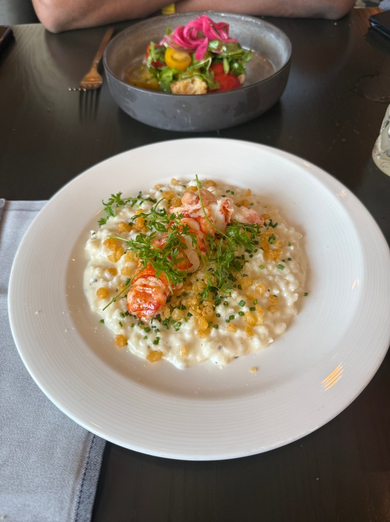 After the steak tartare, the lobster risotto and heirloom tomato salad arrived. Our son LOVED the risotto, a truffle based dish with a perfectly poached lobster tail on top. (We also loved it. The texture was perfect, the risotto an excellent al dente, and the flavors again well balanced).