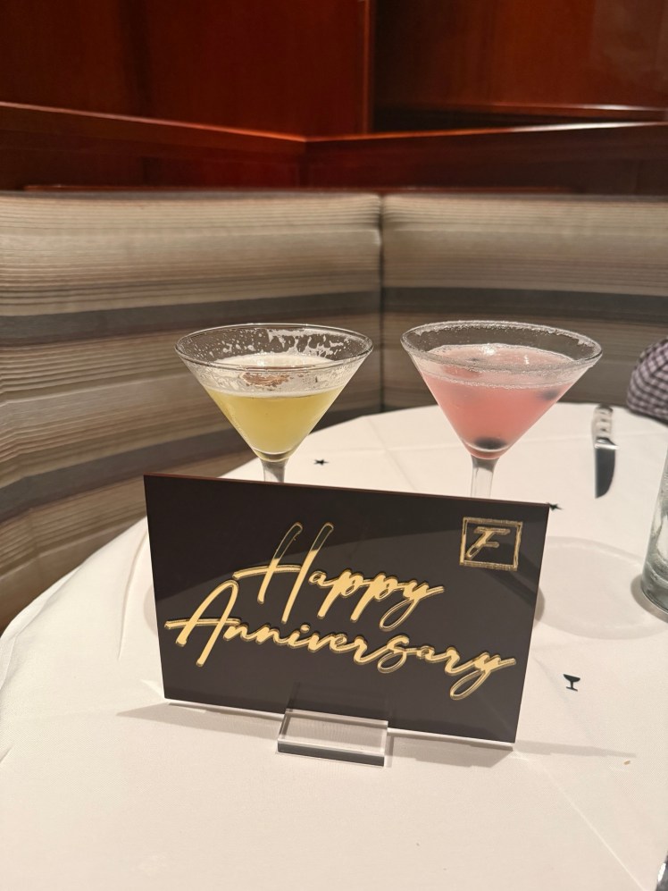We were celebrating our anniversary, and Fleming’s showed up! A signed card, a nice placard to let everyone know, confetti on the table, and the coziest corner booth–we felt very celebrated and cared for.