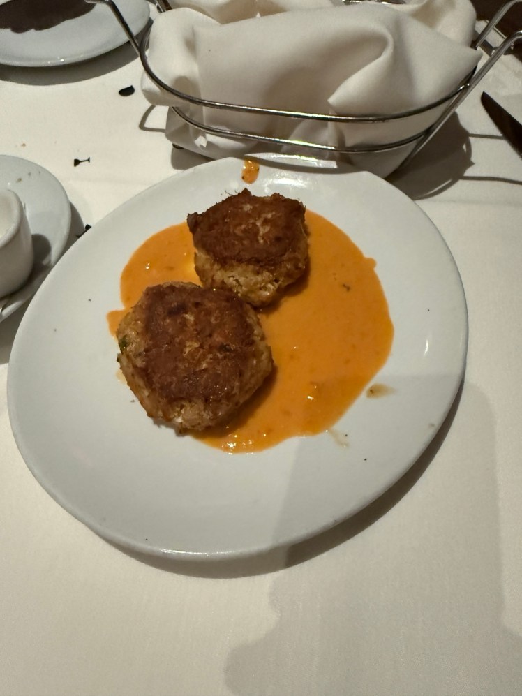 Normally we skip an appetizer but the crab cakes with a roasted red pepper & lime butter sauce were calling our names, and they were so good. Sometimes crab cakes can be more bread than crab, but these were thick, rich, and full of crab–definitely up there with the best crab cakes I ever had. ($31) I highly recommend them as an appetizer, especially if you want some “surf & turf” vibes.