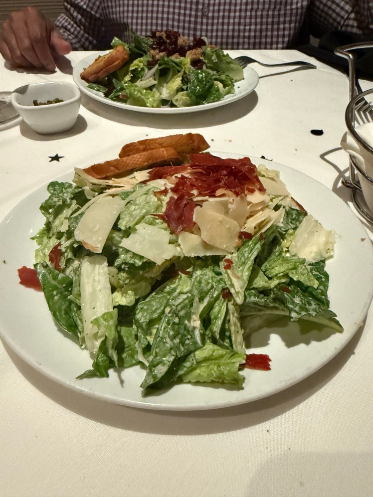 Next it was time for our salads–I opted for a Caesar, as the last time we came, I was pregnant and could not enjoy a Caesar, which is my favorite! At Fleming’s, they top it with large shavings of Parmesan and crispy prosciutto crumbles. Solomon went for the Fleming’s Salad, which is a delicious mix of lettuce, candied walnuts, dried cranberries, red onion, campari tomatoes, and lemon balsamic vinaigrette.