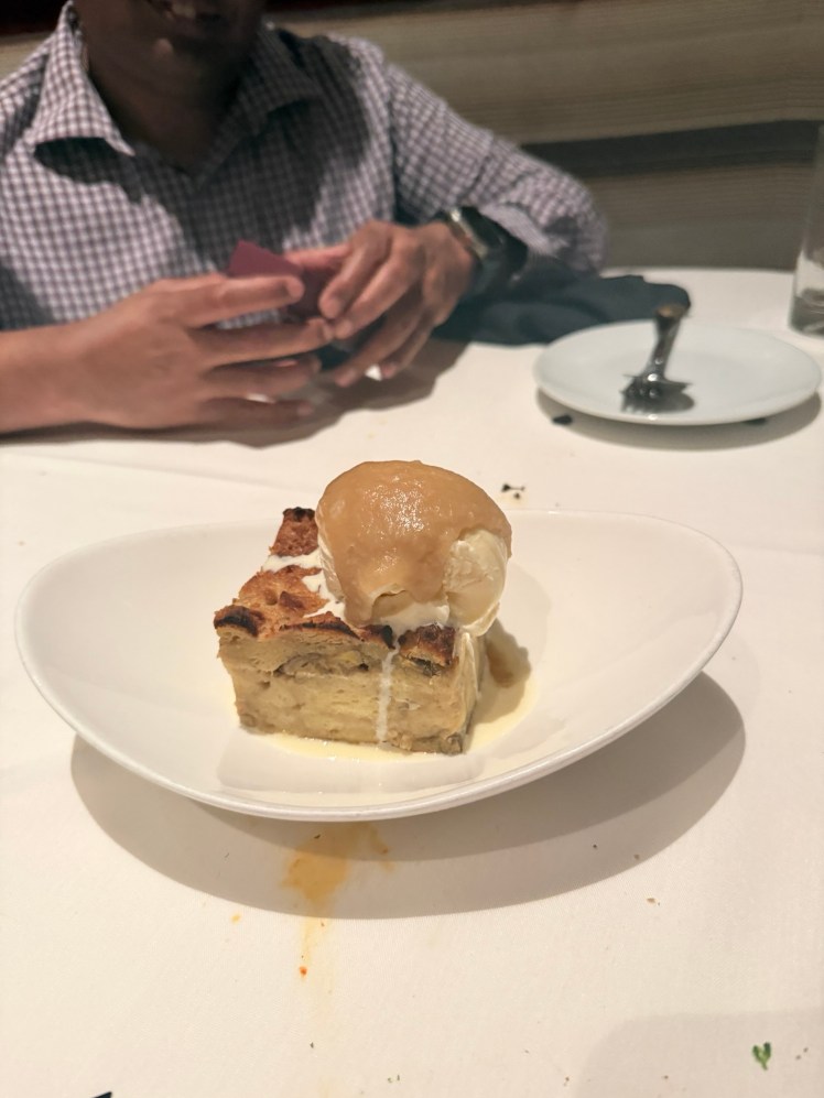 Solomon had seen a special dessert (Bananas Foster Bread Pudding) so we got that along with a creme brûlée to take home. Unfortunately, the torch broke RIGHT after our corn brûlée was prepared, so it ended up just being the vanilla bean custard with berries. It was a tasty dessert the next night though.